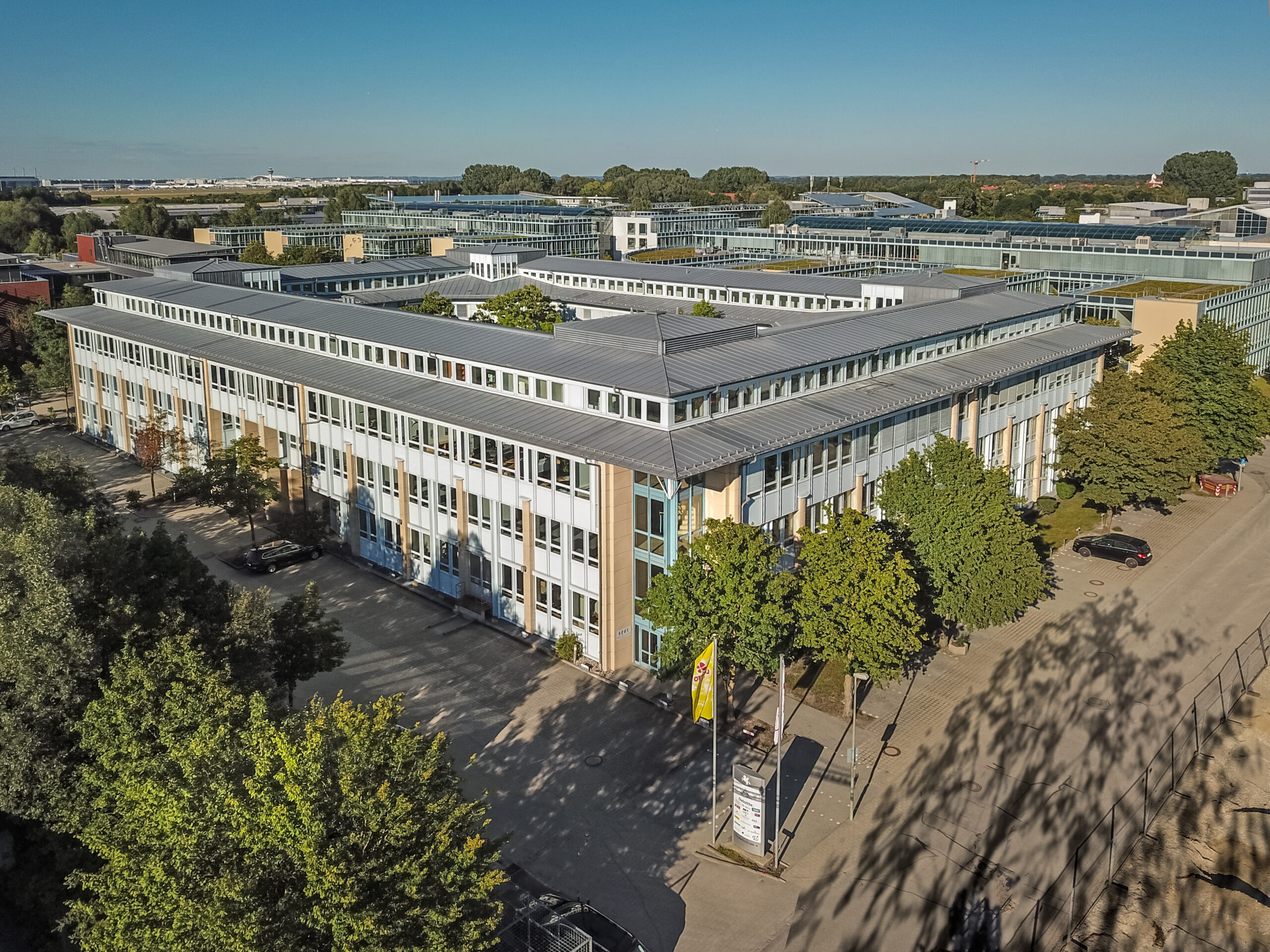 Das Pegasus nimmt innerhalb des Munich Airport Business Park eine besondere Stellung ein. Es vereint die Vorteile moderner, hochwertiger und effizient gestalteter Büroflächen mit einer repräsentativen Unternehmensdarstellung – sowohl im Gebäude als auch an dessen Außenflächen. Mit einer Gesamtmietfläche von rund 9.600 m² zählt das Pegasus zu den kleineren Objekten im Business Park. Es zeichnet sich durch eine lebendige und kollegiale Mietergemeinschaft aus, die aktuell aus 18 Mietpartnern besteht.Ein besonderer Service ist die ganztägige Verfügbarkeit eines Hausmeisters, auch an Wochenenden. Für diesen wurde eine eigene Hausmeisterwohnung im Gebäude eingerichtet, wodurch kleinere Reparaturen und Wartungsarbeiten schnell und unkompliziert durchgeführt werden können. Das Objektbranding und die Namensgebung „Pegasus“ verleihen dem Gebäude einen hohen Wiedererkennungswert und steigern die Aufmerksamkeit bei Besuchern und potenziellen Mietinteressenten. Beleuchtete Pylone vor den Gebäudezugängen und Hauseingängen führen Besucher gezielt zu den jeweiligen Mietern. Die individuell gestalteten Logos auf den Pylonen bieten den Mietern eine zusätzliche Möglichkeit zur Unternehmenspräsentation. Ein maßgeschneidertes Beleuchtungskonzept sorgt für ein attraktives Erscheinungsbild des Gebäudes. Das Pegasus wurde in geschlossener Bauweise mit einer ansprechenden Fassade errichtet. Die großzügigen Schallschutzfenster ermöglichen eine hervorragende natürliche Belichtung der Büroräume. Über den begrünten Innenhof, der gleichzeitig als Erholungsbereich mit Sitzgelegenheiten dient, sind die vier Hauseingänge des Gebäudes erreichbar. Die Außenstellplätze befinden sich rund um das Gebäude und bieten eine komfortable Parksituation. Die Ein- und Ausfahrt der Tiefgarage liegt auf der rechten Seite des Gebäudes. Die Mietflächen sind über innenliegende Verkehrswege bequem und trockenen Fußes erreichbar. Jeder Hauseingang verfügt über ein großzügiges Eingangsfoyer, das bei Bedarf als Empfangsbereich ausgebaut werden kann. Von hier aus sind die Mietbereiche über Aufzüge und Treppenhäuser zugänglich. Der helle Natursteinboden in den Foyers und Treppenhäusern unterstreicht den hochwertigen Charakter des Objekts. Zusammenfassend lässt sich sagen, dass das Mietobjekt Pegasus eine Wohlfühloase für die Mieter darstellt